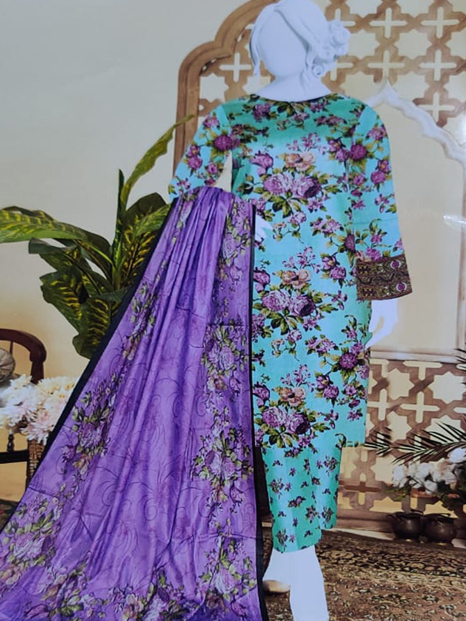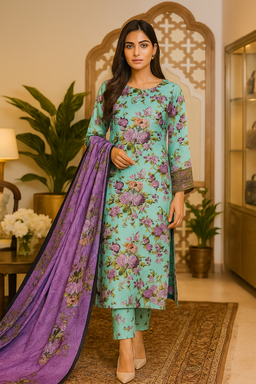 Bring elegance and freshness to your summer wardrobe with this Turquoise Floral Unstitched Lawn 3 Piece Suit for Women. Designed with intricate purple rose prints and a flowy printed dupatta, this outfit offers unmatched comfort and style in premium lawn fabric—perfect for hot weather in Pakistan.